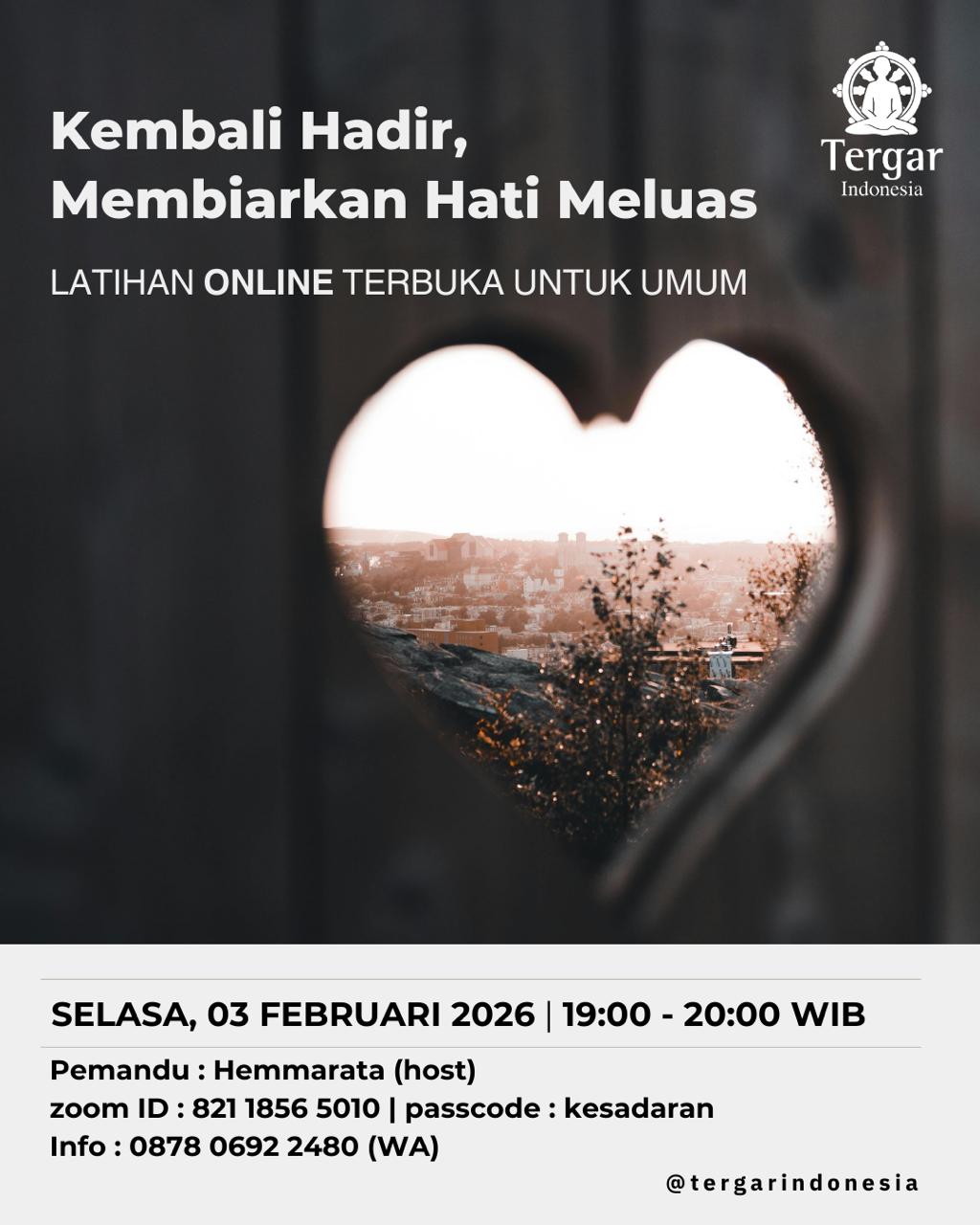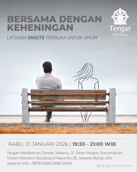 Seringkali keheningan diasosiasikan dengan kemalasan dan tidak produktif, padahal belajar "bersama" dengan keheningan dalam kondisi meditatif dapat perlahan mengubah kehidupan Anda. Terbuka untuk umum dan bebas biaya Rabu, 21 Januari 2026 19:30-21:00 WIB Lokasi: Tergar Meditation Centre Jakarta. Alamat: Jl. Daan Mogot, Perumahan Green Mansion, Boulevard Raya No.35, Jakarta Barat Maps: https://goo.gl/maps/maVW3Y3upjbVouqm8 Info: * WA: …